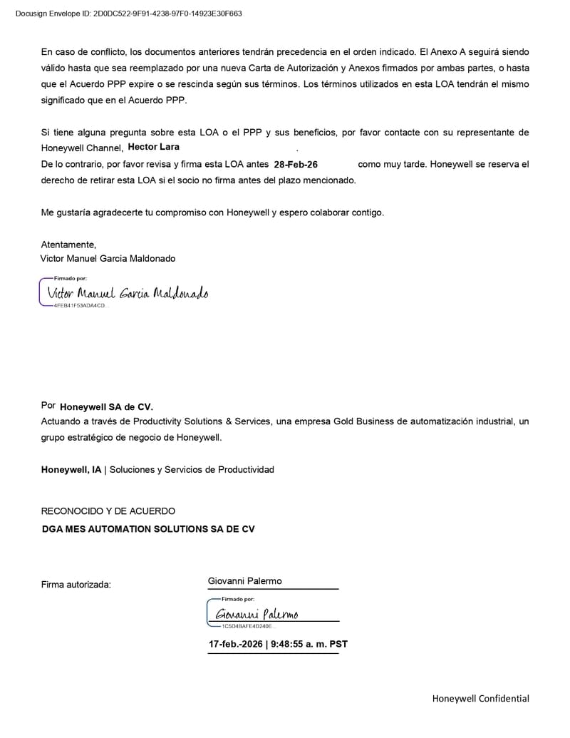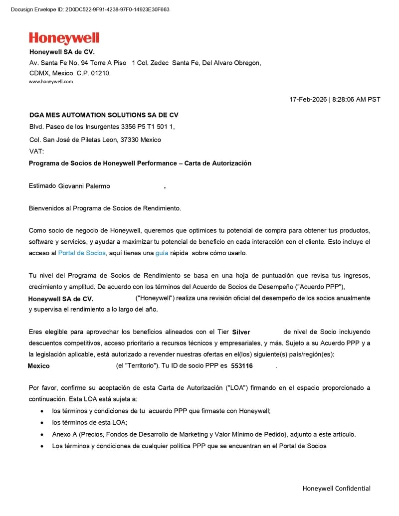 Este certificado acredita a DGA MES Automation Solutions SA de CV como socio autorizado de Honeywell dentro del Honeywell Performance Partner Program (PPP), con nivel Silver y autorización de reventa en el territorio asignado. Además de formalizar la relación comercial con el fabricante, esta acreditación ofrece beneficios relevantes como acceso a descuentos competitivos, recursos técnicos y empresariales prioritarios, así como el respaldo del ecosistema de partners de Honeywell, lo que fortalece nuestra capacidad para ofrecer soluciones industriales con mayor soporte, cumplimiento y confianza para nuestros clientes.